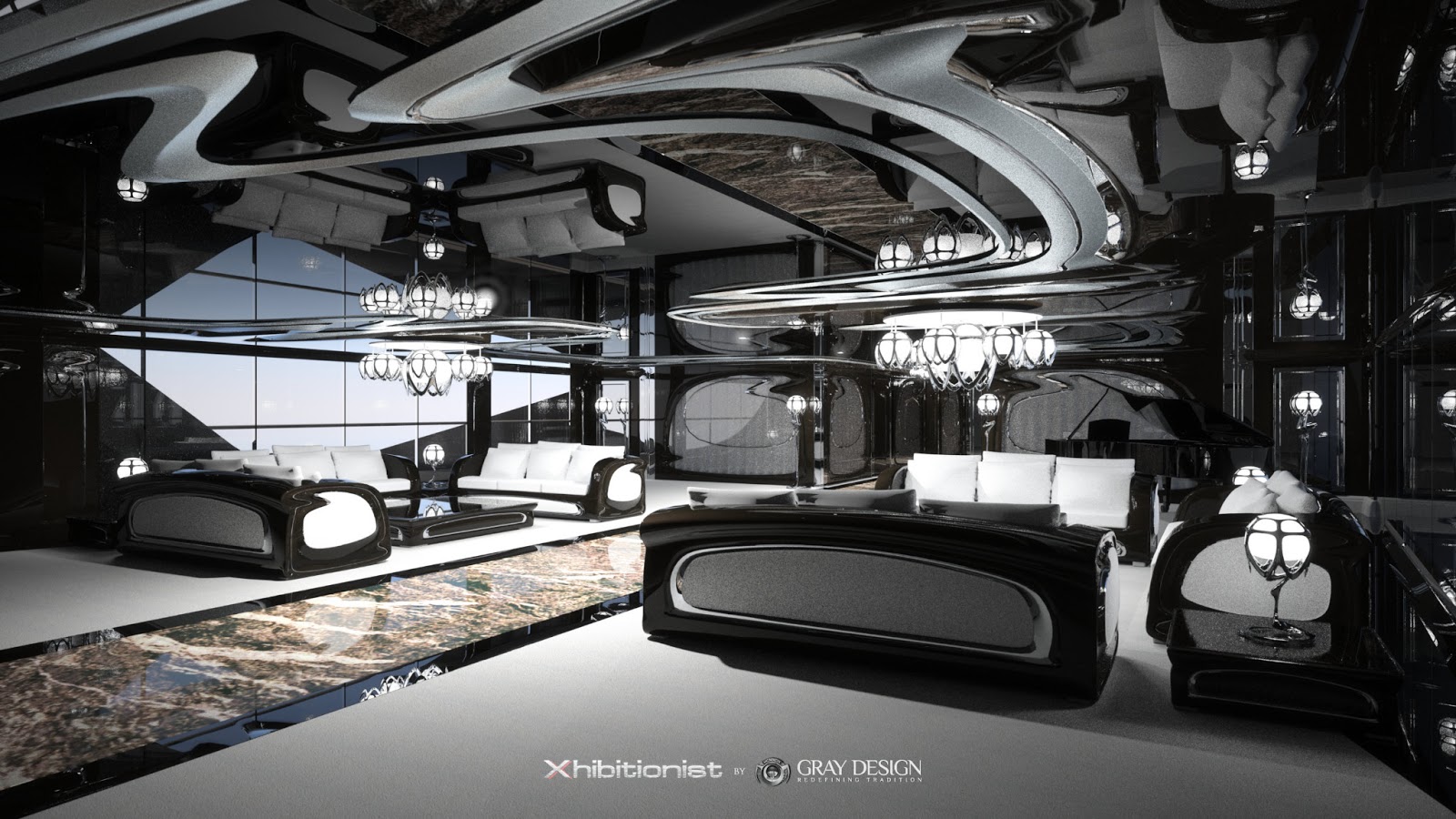 The hull is described as an inverted trimaran, and the sportscar influence is clear to see (indeed, Gray has designed the Xhibit-G supercar to compliment Xhibitionist). The yacht is, unsurprisingly, packed with innovations. Huge solar panels open out of the superstructure like the hood of a giant sports car, providing a source of power, but they are also, Gray suggests, capable of acting as a helipad or a stage.